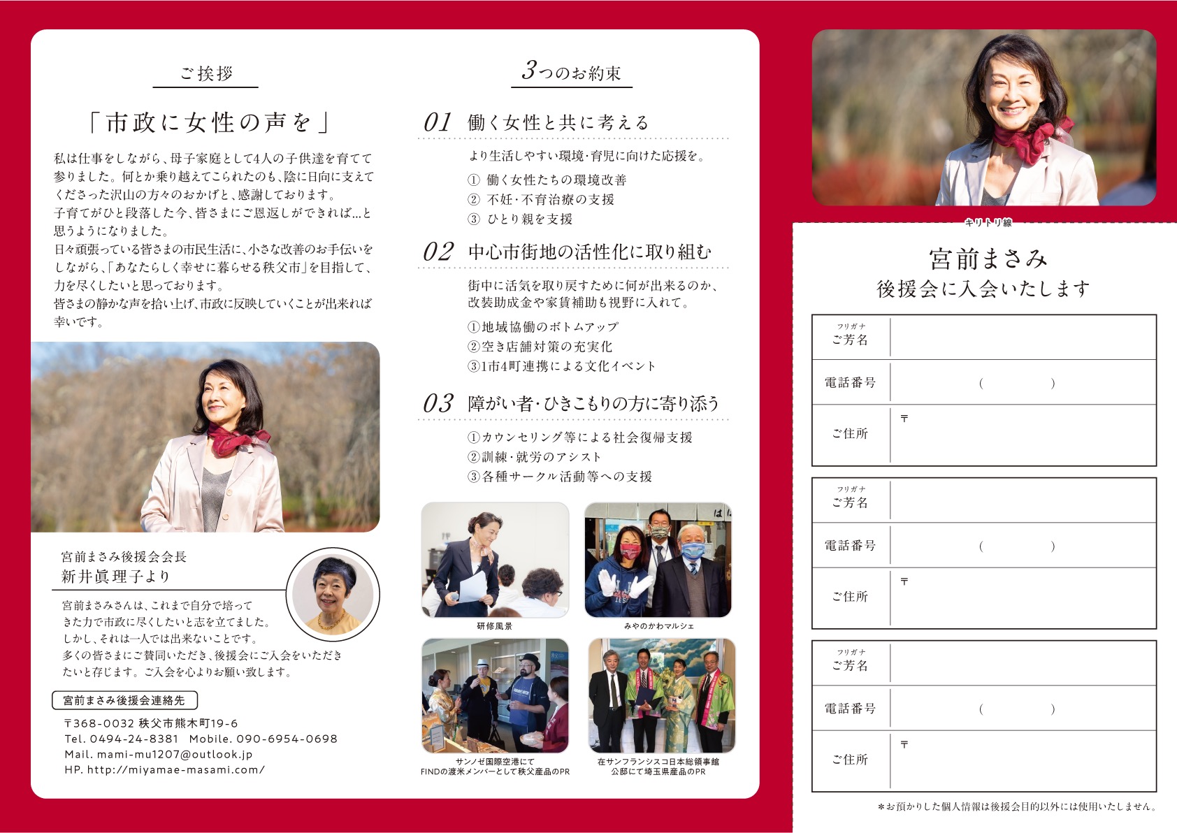 「女性の声を市政に届けたい」と、無所属で後援会活動を開始致しました。是非一人でも多くの方にご賛同いただき、後援会へご入会いただければ幸いです。