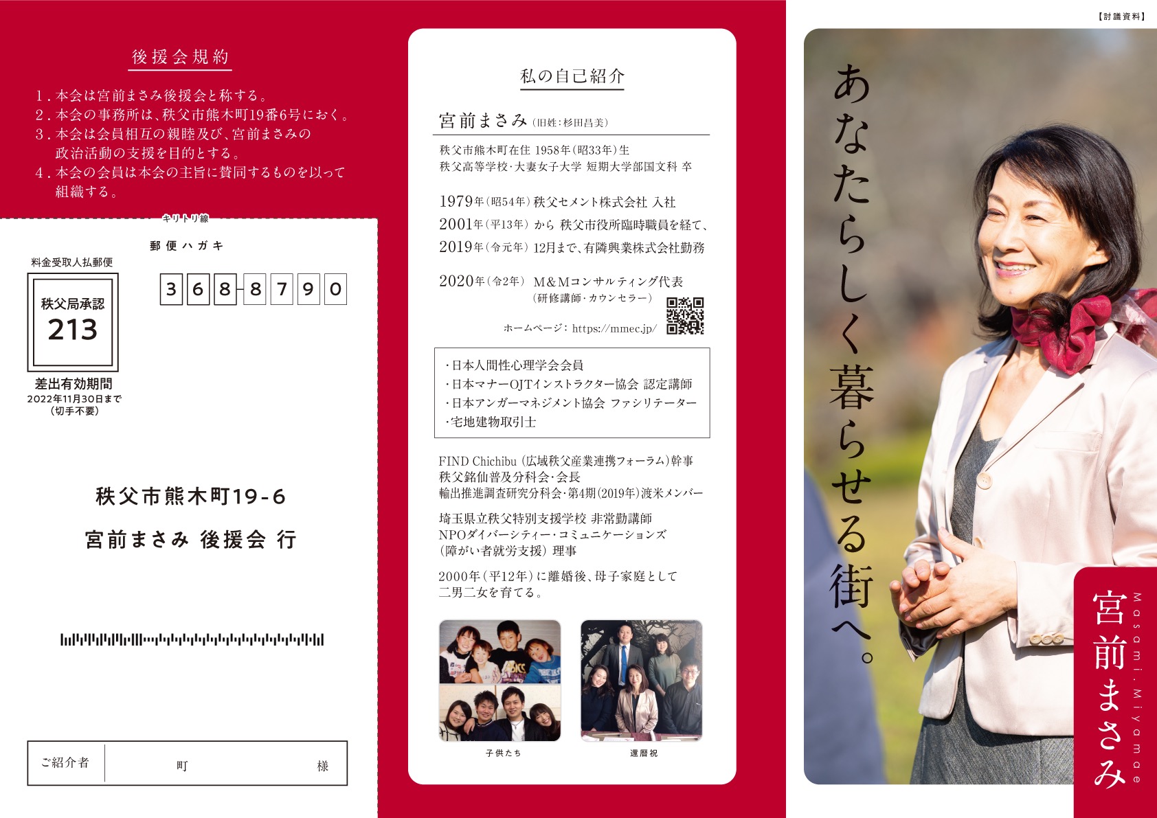12月に入って「宮前まさみ後援会」のリーフレットができました。この20日間で、4000部をあちこちに配布しています。皆さんとても好意的に受け取ってくださり、嬉しい限りです。