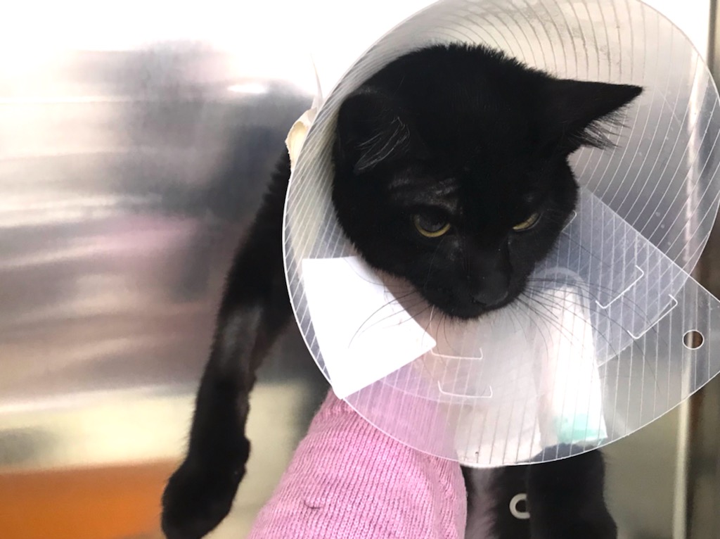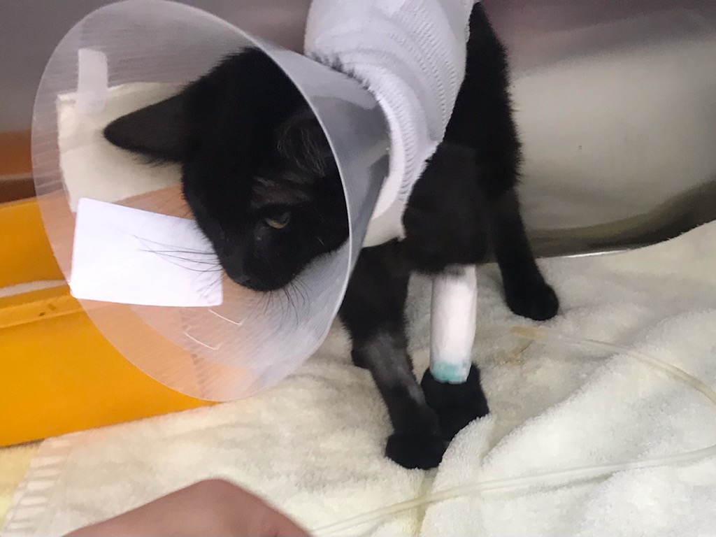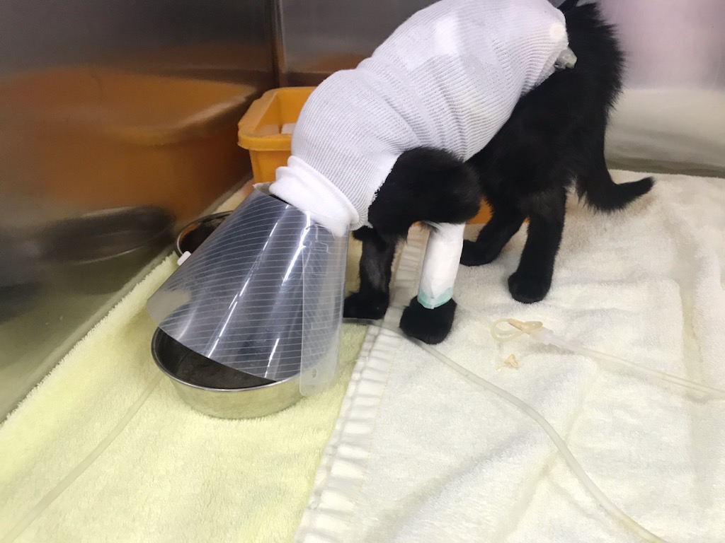 面会に再度深谷に向かったら、両脇に点滴の袋を置かれぐったりと横わたるおこげの姿。飲み込んだ異物が腸で複雑に絡み合い詰まっていて、更に腸には16箇所もの穴が開いていたとのこと。