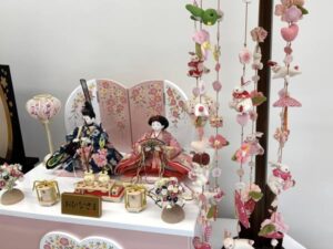 “ふじや衣装”さまでは、打掛と吊るし雛のコラボがご覧いただけます。重厚感に溢れた立派な打掛に、帯むすびも素敵!