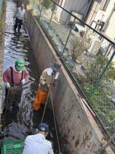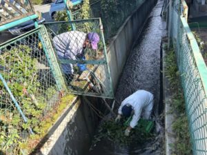 腰田堀に溜まった落ち葉や枝を堀から引き上げ、下流の町会にご迷惑が掛からないよう、町会長以下ビショビショになりながらの大奮闘!