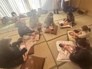 ベビーマッサージは、指導者のナオさん(助産師)も子育て中ながら、裸の赤ちゃんとの触れ合い方などを教えてくださいます。