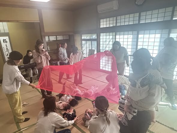 ベビーリトミックでは、ママも赤ちゃんと一緒に楽しめる手遊びや、スカーフを使ってのフワフワ体験を。