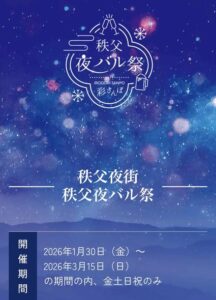 今年の「秩父夜街・彩さんぽ」は、1月30日(金)から3月15日(日)の、“金土日・祝日”開催。