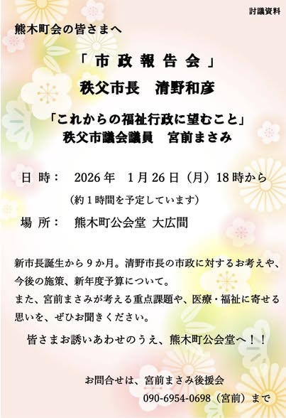 市長は熊木町のご出身でもあり、公民館ではなく、公会堂規模での報告会は、市長としては初めてかもしれません。