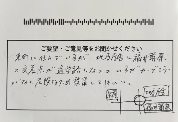 カーブミラーの設置に関しては、町会長の要望書も必要なため、市の地域整備部に確認したところ、現時点では「提出されてはいない。」とのこと(提出と設置がズレることもあります)。