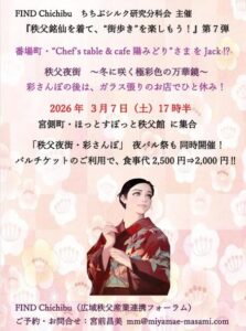 FIND Chichibu “ちちぶシルク研究分科会”主催の「秩父銘仙を着て、街歩きを楽しもう!・第7段」も、今週末3月7日(土)の開催です。